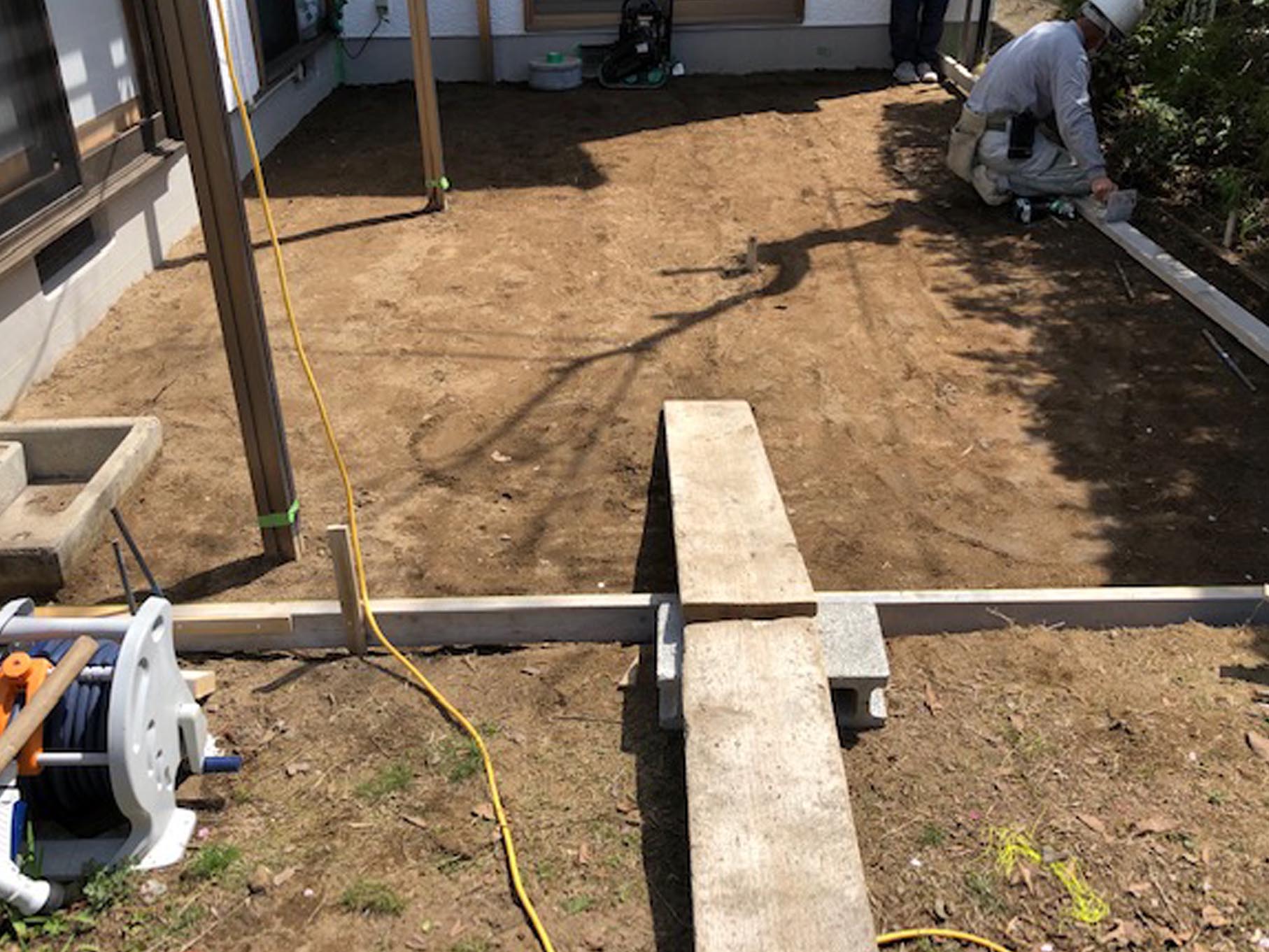 当初は、巾木から約1mの土間工事の後、残りの範囲は天然芝を張るご予定でしたが、将来範囲を広げて工事をしたいというご希望の中、広い範囲でのレンガ敷工事に決定致しました。